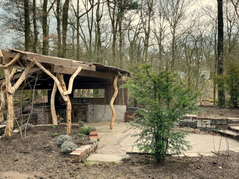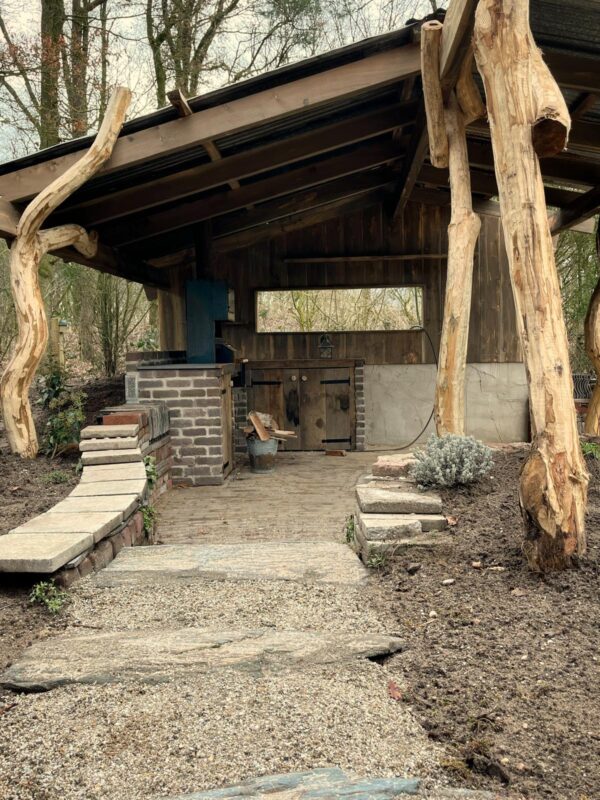 Bij Joop Thuis ligt juist centraal op ons kampeerterrein: levendig aan de voorzijde en met een rustige bostuin aan de achterkant. Hier vind je ook een fijne buitenkeuken.