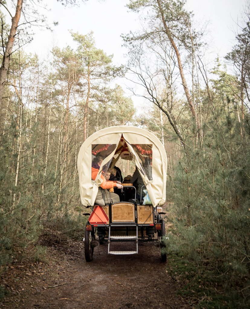 Een mooie tocht van anderhalf of drie uur door De Maashorst per huifkar. Deze tocht biedt een totaaloverzicht van De Maashorst met zijn bossen en heidevelden. Als ze zich laten zien, spot je de taurossen en exmoorpony’s. Er kan gestopt worden bij de breukrand, vorstengraven en het heidegebied en er kan gepauzeerd worden bij natuurcentrum Slabroek. Dit kan in overleg met de koetsier.