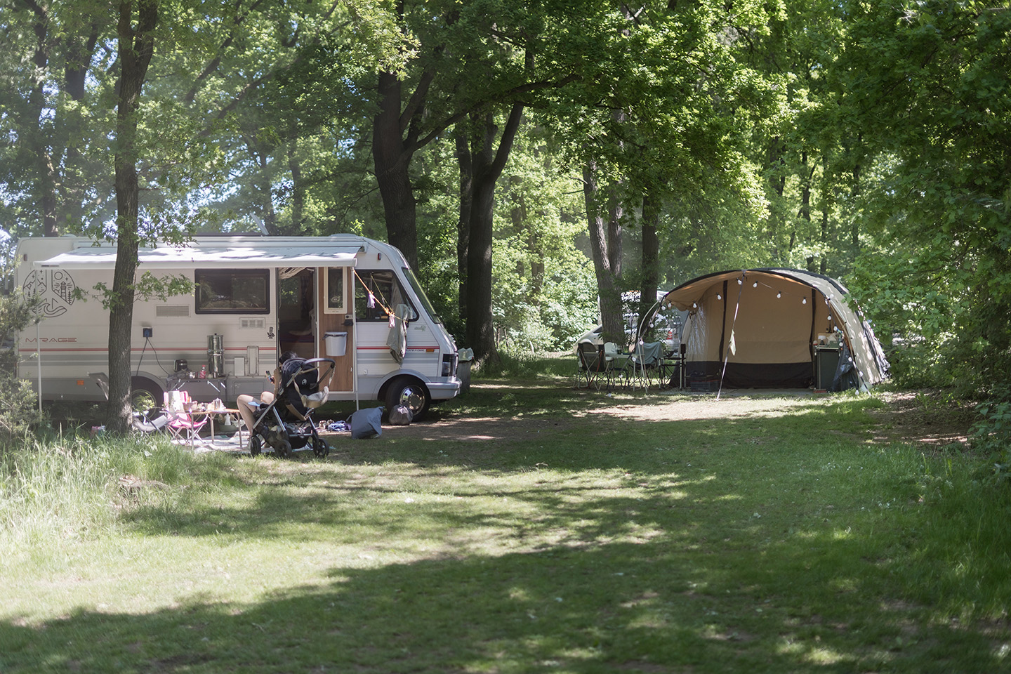 Alle charme kampeerplekken bij Hartje Groen zijn voorzien van stroom. Standaard krijg je 8 ampère — dat is ruim genoeg voor een koelkast, lampjes en een kopje koffiezetten. Maar wie bijvoorbeeld graag op elektra kookt met wat meer power (of een haarföhn in de voortent gebruikt) kan extra ampères bijboeken. Bij het boeken kun je heel eenvoudig aangeven hoeveel je eventueel extra wilt: